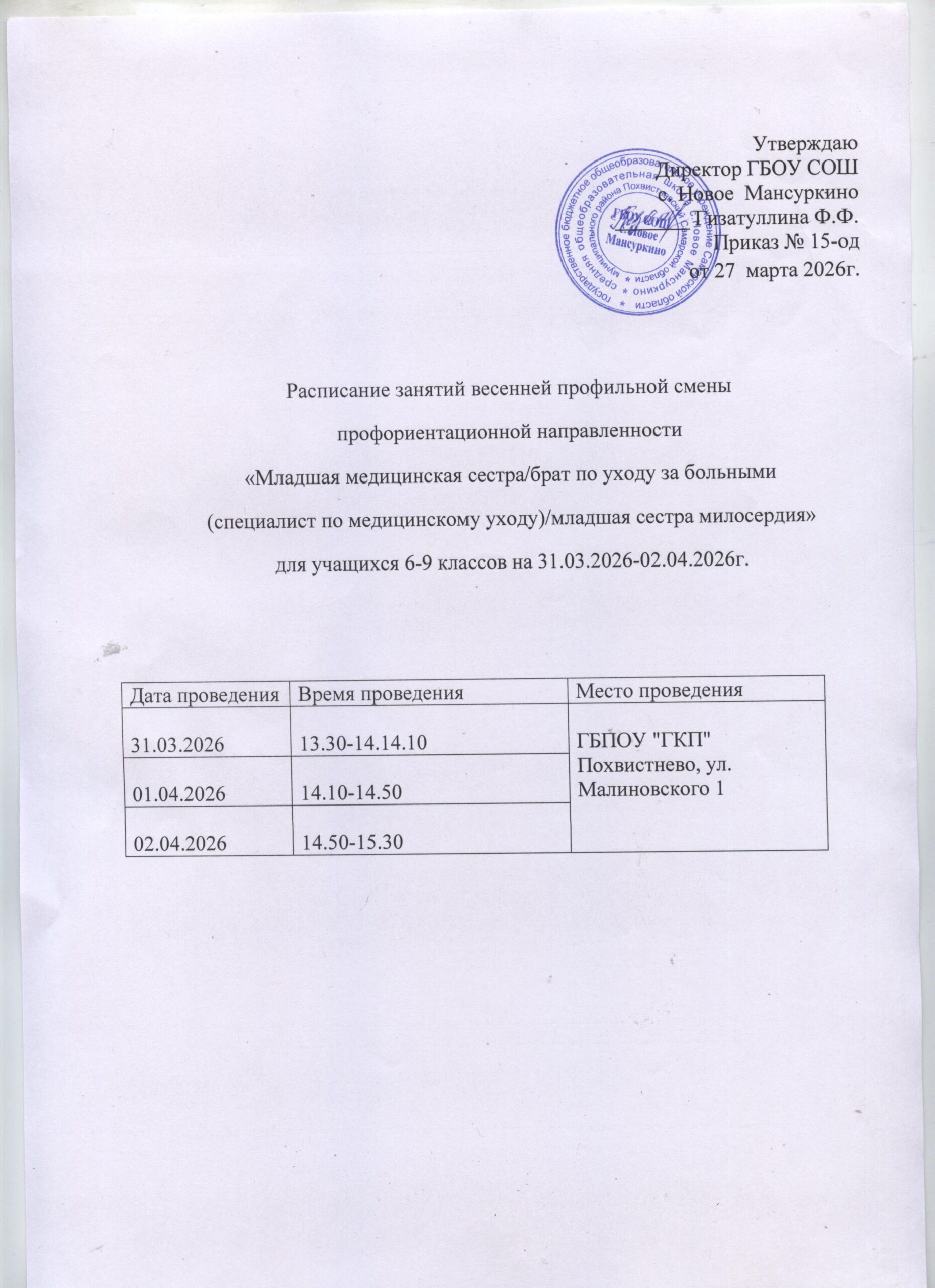 Расписание занятий весенней профориентационной смены «Младшая медицинская сестра»  СКАЧАТЬ